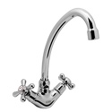 Назначение: кухонный • Конструкция: двухрычажный • Монтаж: горизонтальный • Клапан: керамический • Материал: латунь, покрытие - хром • Подводка: гибкая • Монтажные отверстия: 1 отверстие • Форма излива: традиционная • Душевая лейка в комплекте: нет • Аэратор: есть • Донный клапан в комплекте: есть