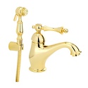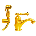 Назначение: для умывальника • Конструкция: однорычажный • Монтаж: горизонтальный • Материал: латунь, покрытие - бронза • Подводка: гибкая • Монтажные отверстия: 1 отверстие • Форма излива: традиционная • Душевая лейка в комплекте: есть • Держатель для душевой лейки: настенный держатель • Донный клапан в комплекте: есть